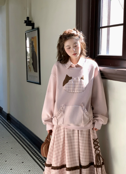 大口吃芝士 猫咪粉色卫衣粉格半裙套装甜美可爱