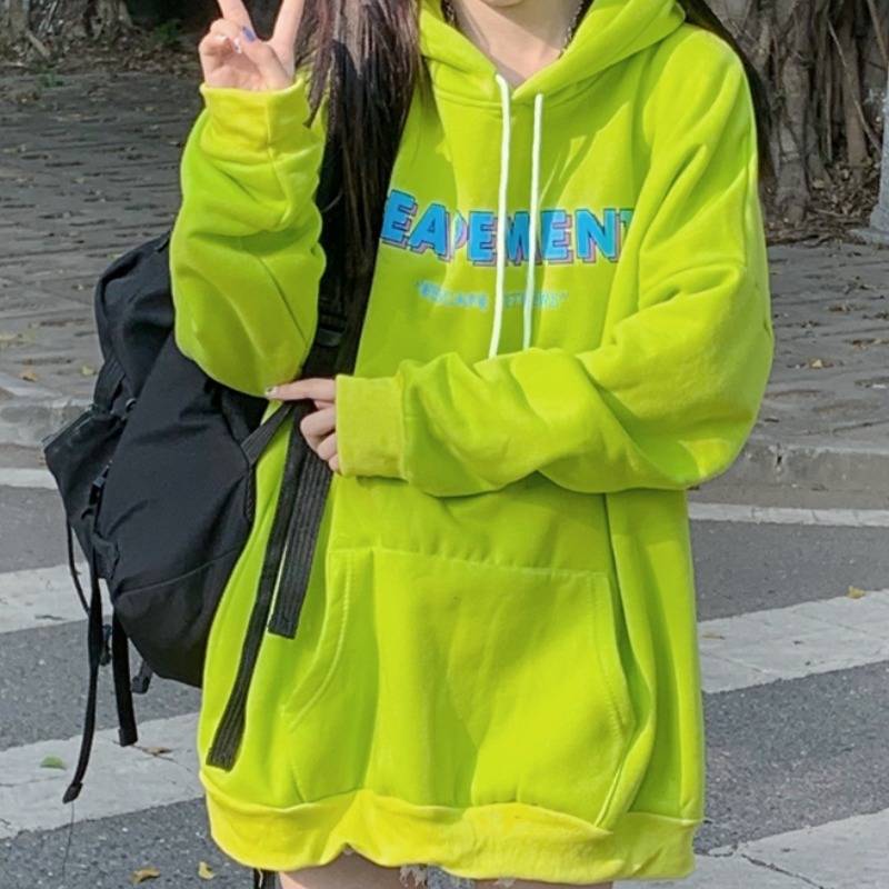 韩版ins港风加绒加厚连帽上衣宽松绿色卫衣外套女潮