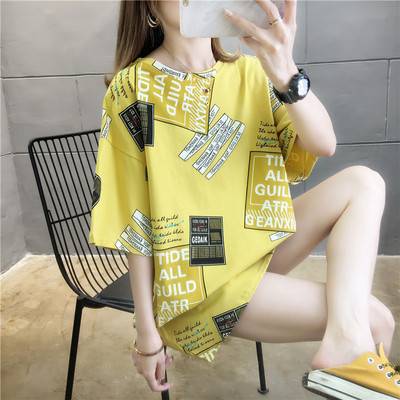 适用年短袖t恤女纯色宽松夏潮2022年新款卡通大码胖mm中长款半袖