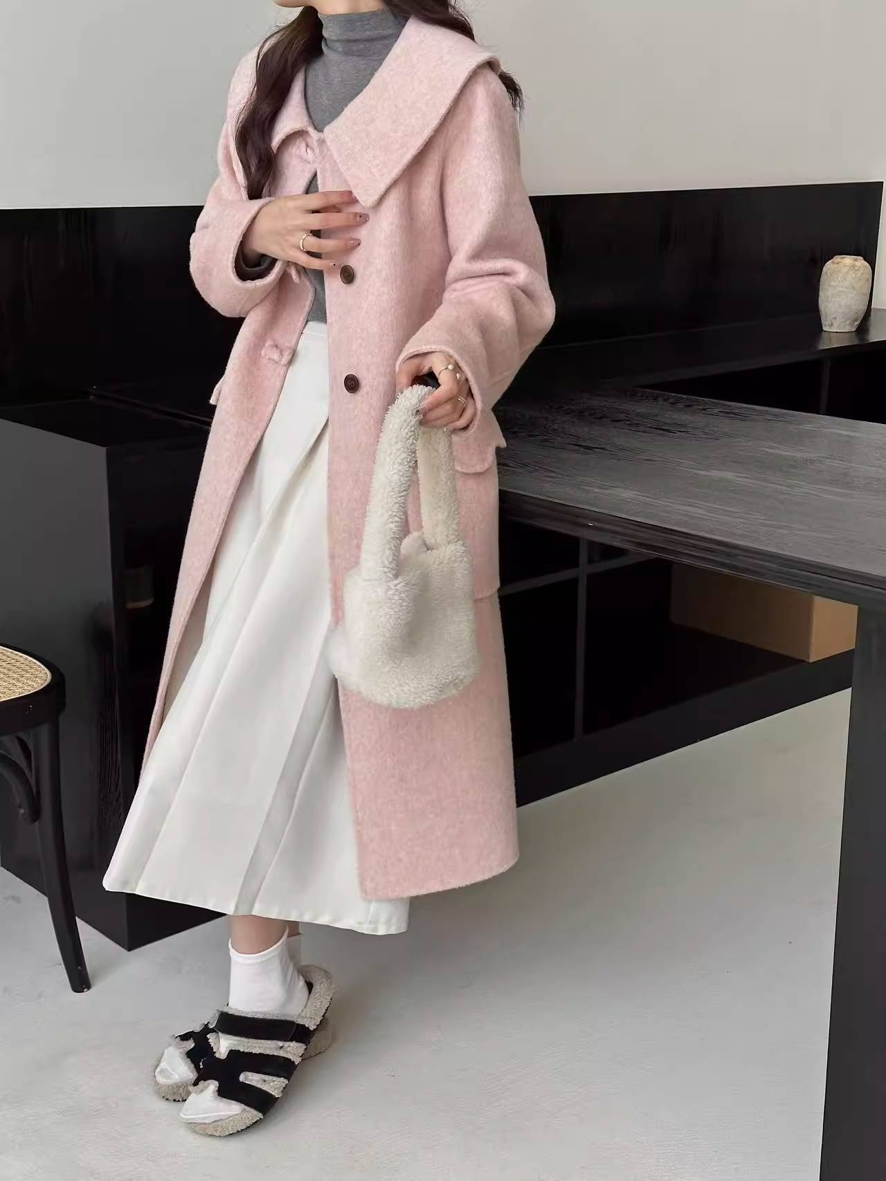 大娃娃领双面羊毛大衣女长款大口袋小个子学院风长毛加厚羊绒外套