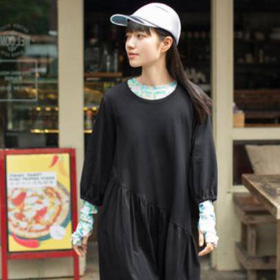 秋新款圆领拼接文艺森系宽松不对称短袖连衣裙女