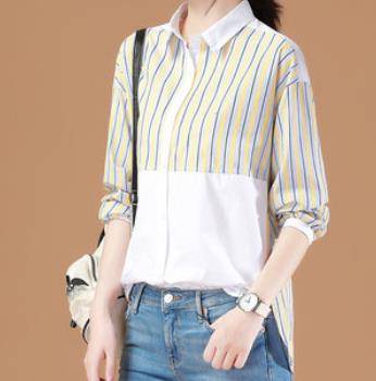 拼接条纹长袖衬衣女2021秋装新款宽松百搭休闲纯棉白衬衫
