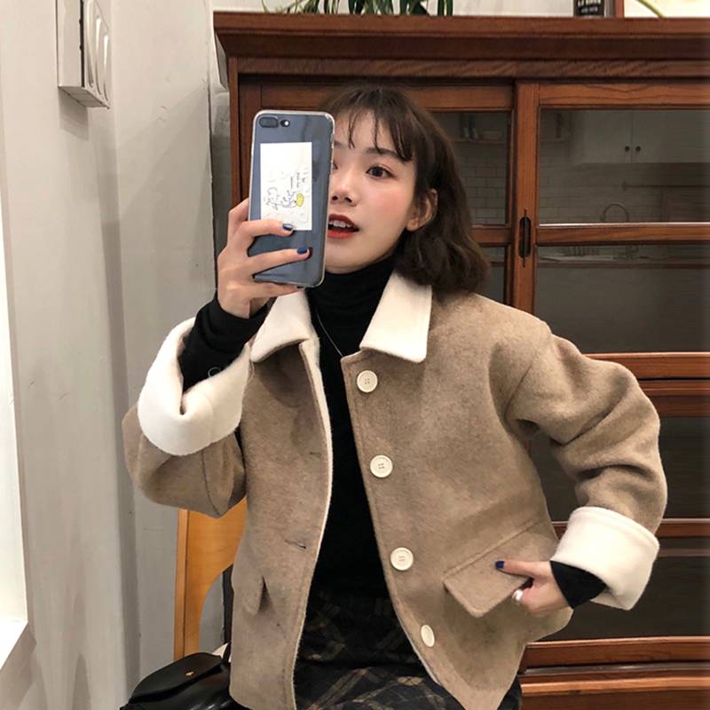 2019秋冬新款韩版复古百搭短款毛呢外套女小个子长袖呢子上衣
