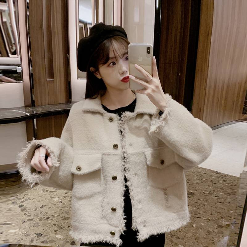 韩版破洞宽松短款毛呢外套女秋冬新款2019流行时尚小香风呢子大衣