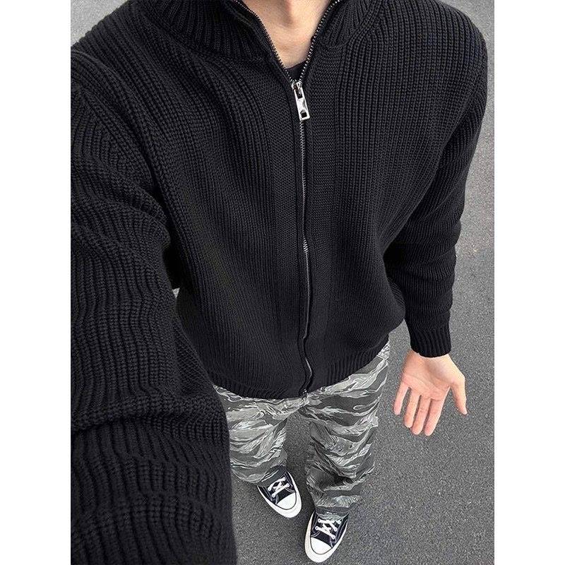 cleanfit灰色开衫毛衣男秋冬季韩系慵懒风针织衫拉链美式立领外套
