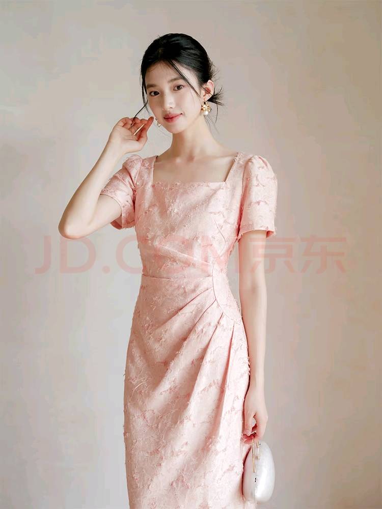 乐町气质复古连衣裙2021新款春女装奶油蜜桃蝴蝶结连衣裙