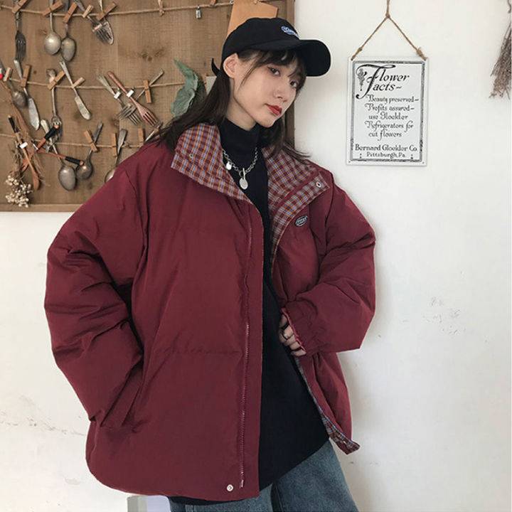 酒红色棉袄面包棉服外套女2021新款冬季韩版宽松加厚港风学生棉衣