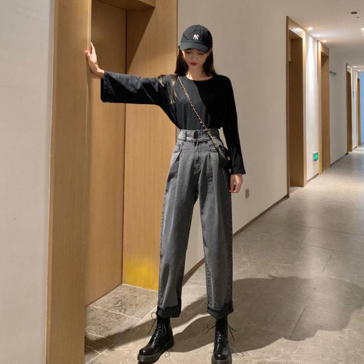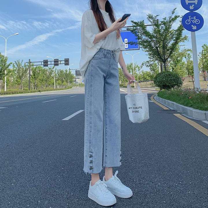 高腰牛仔裤女宽松阔腿2021秋季新款显瘦百搭开叉烟管九分直筒裤子