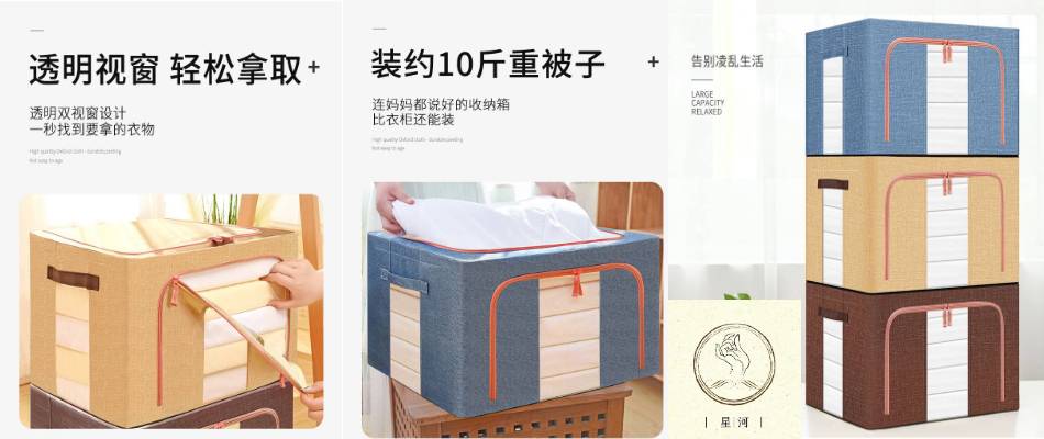牛津布钢架收纳箱 有盖大号66升整理箱 棉麻玩具衣服储物收纳盒