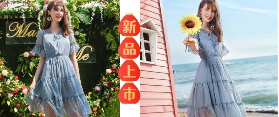 2022夏季新款品牌女装v领纯色拼接a字裙淑女显瘦雪纺连衣裙
