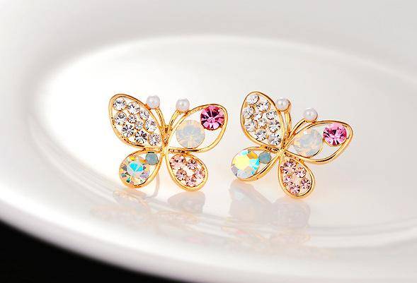 B177韩版高档饰品 珍珠蝴蝶镂空彩钻耳钉 韩国新款耳环