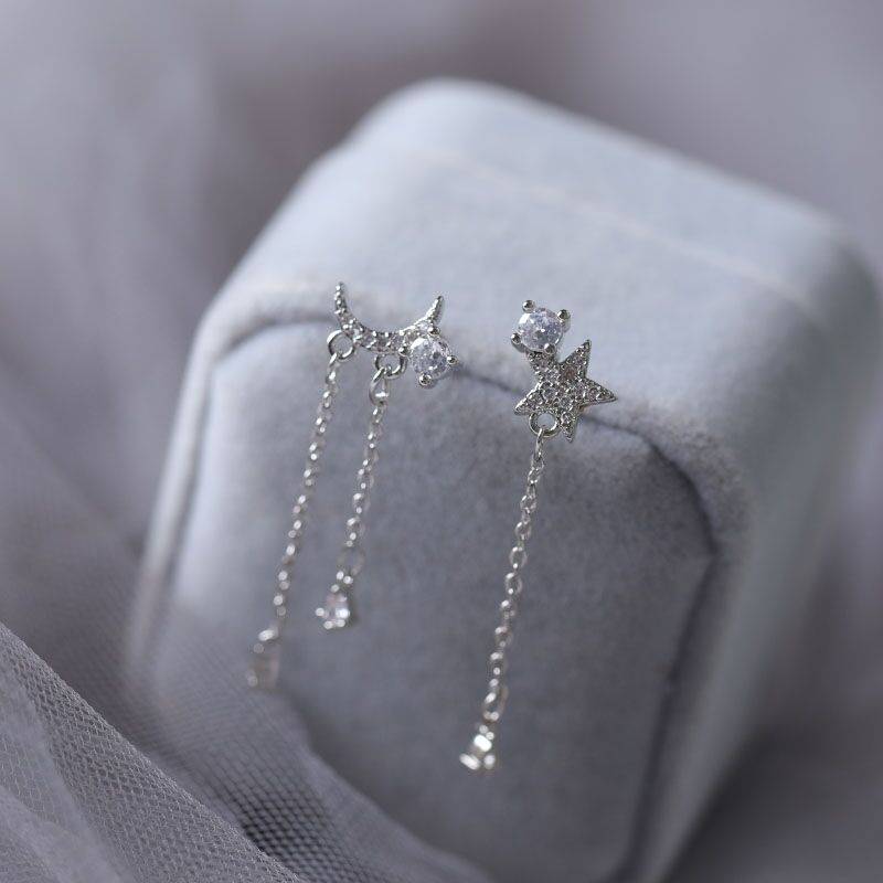 925银新款耳坠女韩国个性百搭短发不对称星星耳环镶钻五角星耳钉