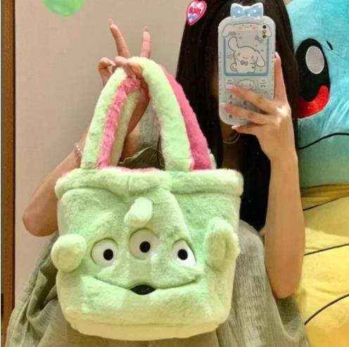 新款三眼仔双面女包草莓熊毛毛包可爱包包草莓熊毛绒单肩包手提包