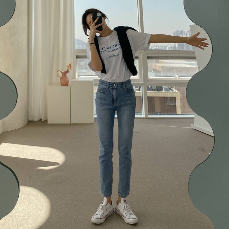 小众浅色直筒牛仔裤女高腰显瘦春夏2022法式修身chic九分裤小个子