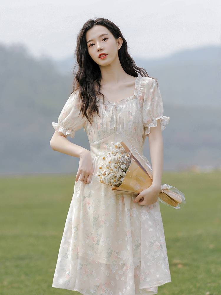 雪纺碎花连衣裙女夏2022新款泡泡袖法式初恋裙复古温柔小个子裙子