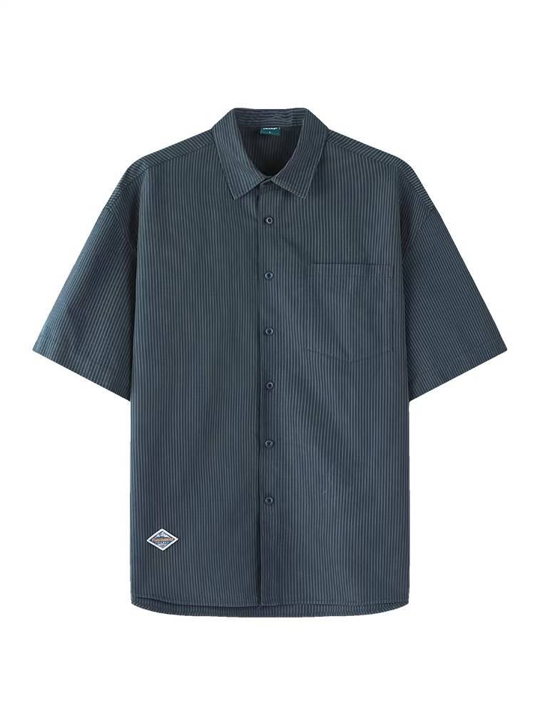 夏季复古细条纹短袖衬衫男生潮流小贴袋装饰五分袖衬衣外套