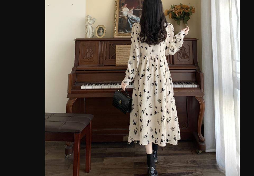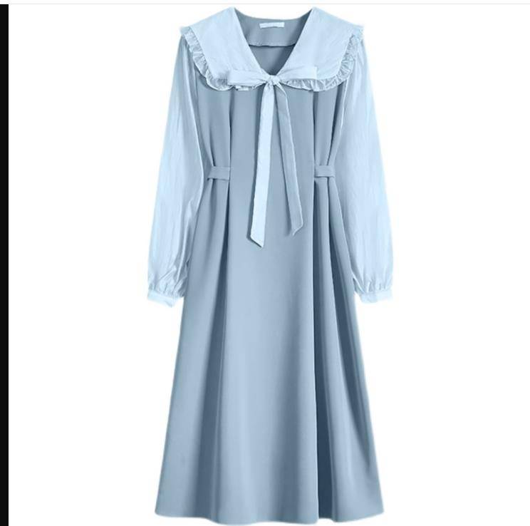 韩系撞色娃娃领过膝长裙子女春秋冬季大码收腰显瘦气质碎花连衣裙