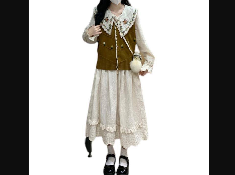 套装女春季新款复古法式叠穿马甲针织衫+紫色长袖连衣裙两件套潮