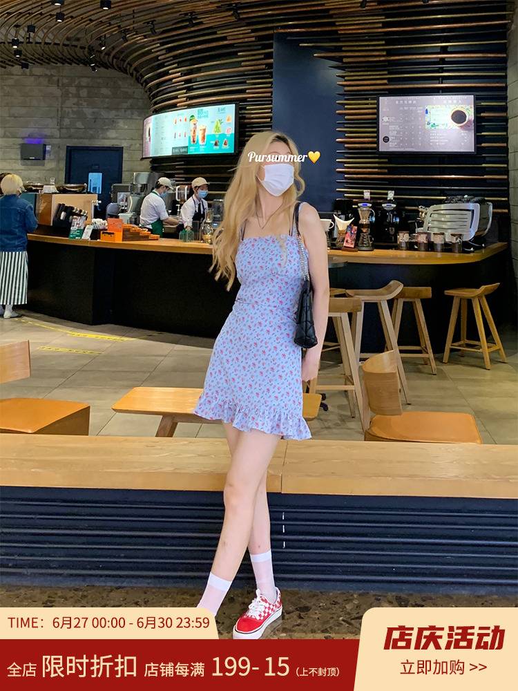 假1赔10法式碎花吊带连衣裙女高腰小众荷叶边a字茶歇裙设
