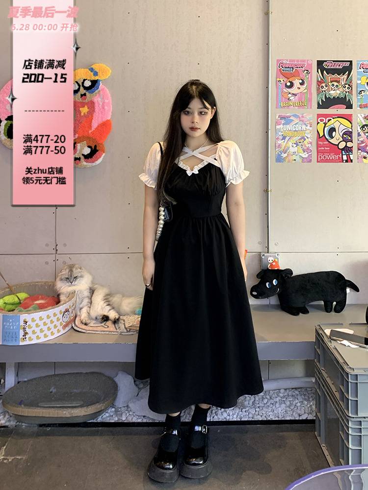 黑泽玄七2022夏季新款绑带连衣裙女微胖mm遮肉显瘦拼接过膝长裙子