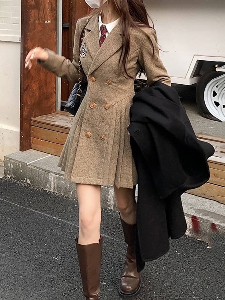 画解WAHJUIS 霍莉顿商学院 呢子西装连衣裙女冬显瘦长袖百褶短裙