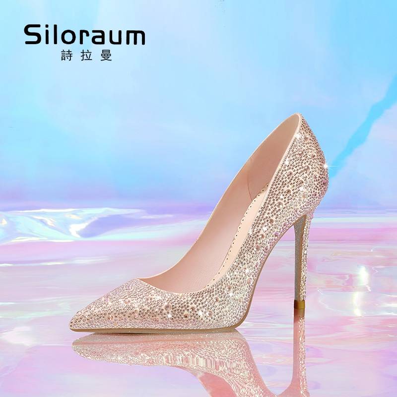 2021新款桑蚕真丝女婚鞋金色闪亮水钻尖头高跟鞋10cm细跟新娘鞋