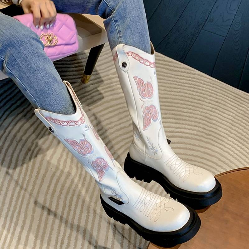 复古v口刺绣西部靴真皮厚底长靴白色长筒靴女骑士靴增高筒牛仔靴