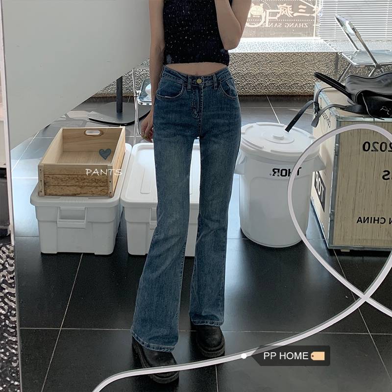 PPHOME妈生超模腿~韩系酷甜小辣妹复古修身显瘦显腿长喇叭牛仔裤