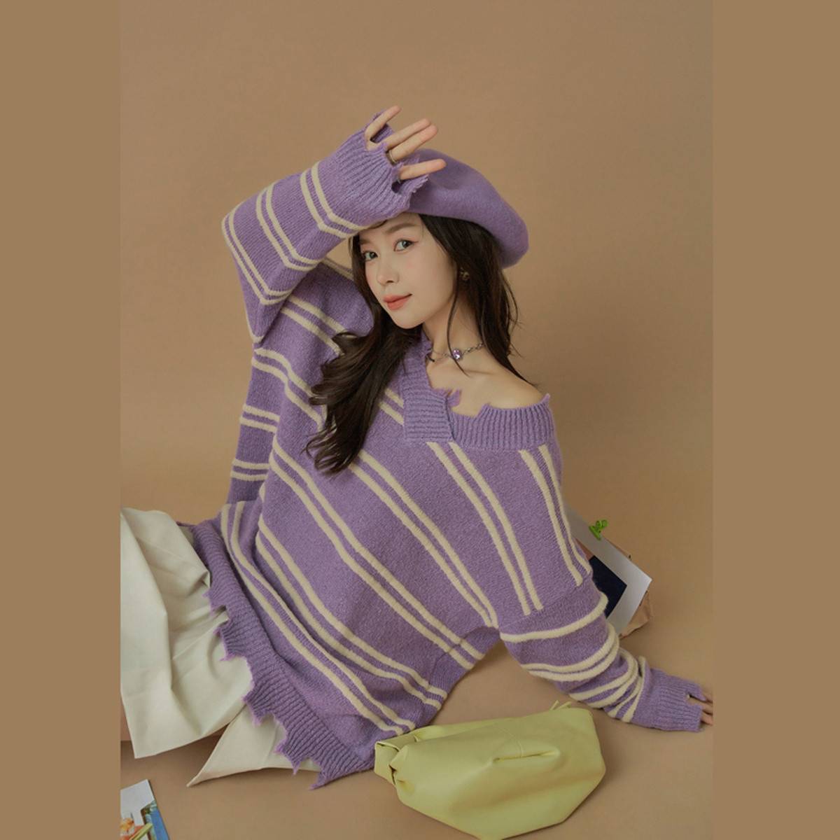 温柔软糯针织衫女2021秋冬新款条纹气质慵懒风长袖毛衣