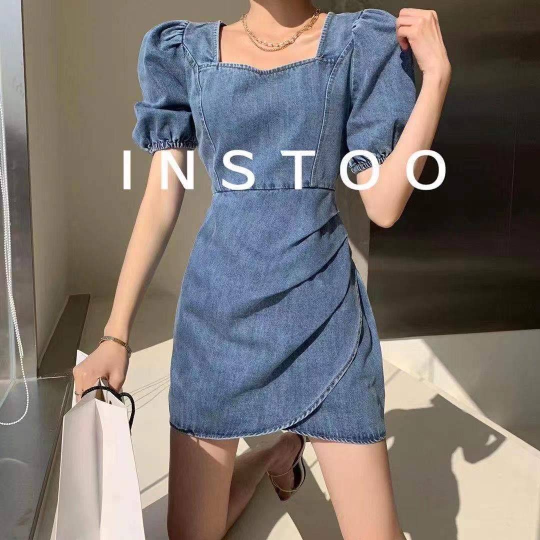 2021新款春季法式复古洋气泡泡袖收腰显瘦方领牛仔裙