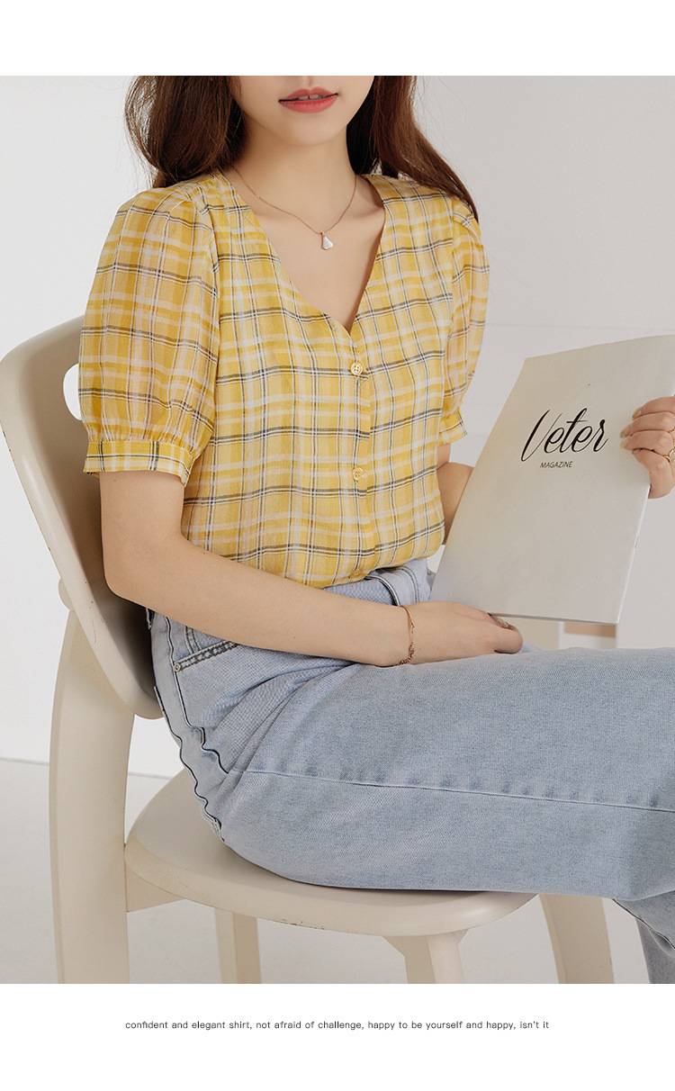 黄色格子衬衫女韩版宽松百搭2021新款夏季上衣雪纺衬衣潮
