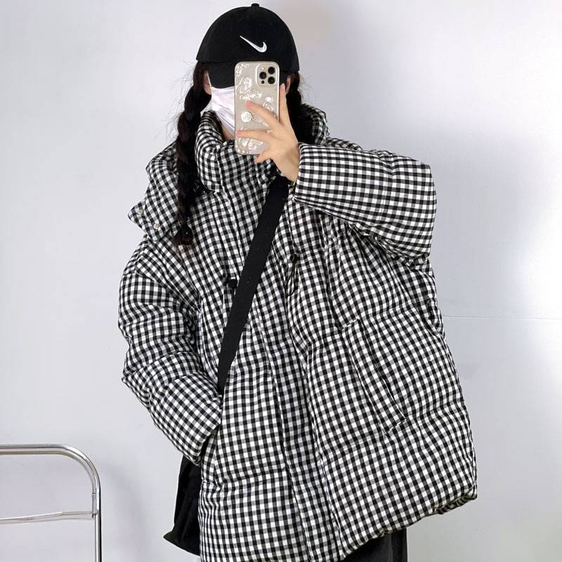 黑白格子羽绒棉服女2021年新款小个子oversize爆款棉衣棉袄厚外套