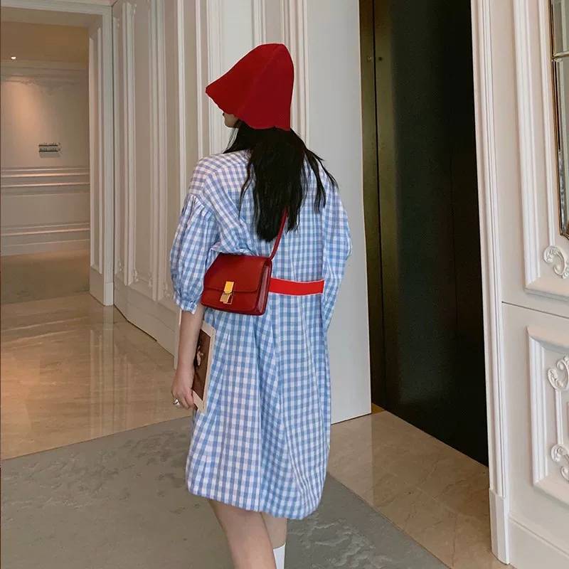时尚复古格子连衣裙女2020夏新款泫雅宽松显瘦V领休闲短款衬衫裙