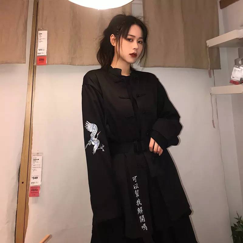 改良唐装立领衬衫女2019秋季仙鹤刺绣外套复古盘扣长袖宽松衬衣潮