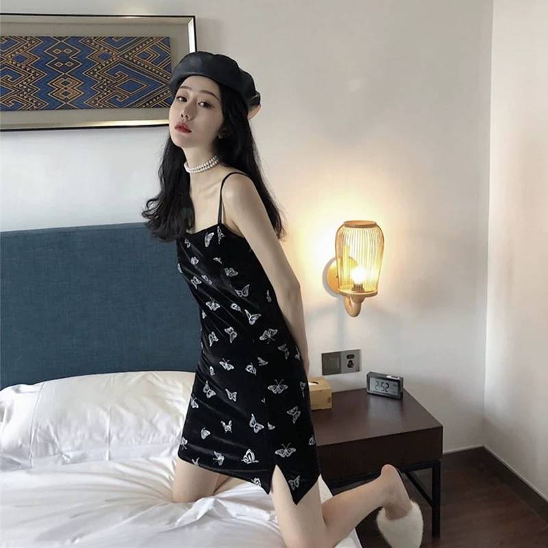 吊带裙复古冷淡风蝴蝶印花丝绒黑色连衣裙夏2020小黑裙短款赫本潮