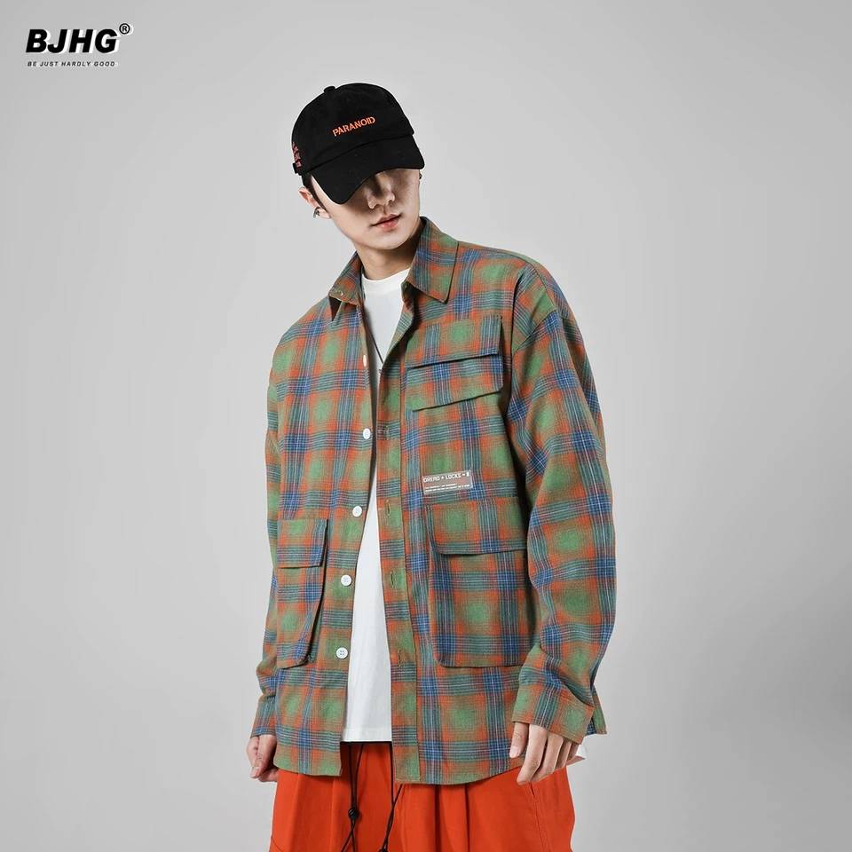 BJHG不计后果春装格子衬衫男生欧美街头古着潮牌彩色工装长袖衬衣