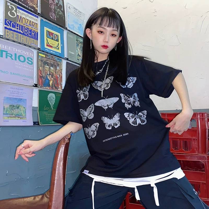 原宿风蝴蝶印花短袖女宽松春夏ins潮学生韩版帅气圆领中长款T恤