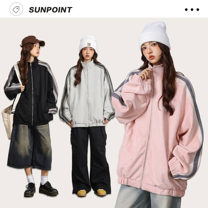 秋季新款运动外套女hiphop美式复古立领夹克条纹宽松慵懒中性上衣