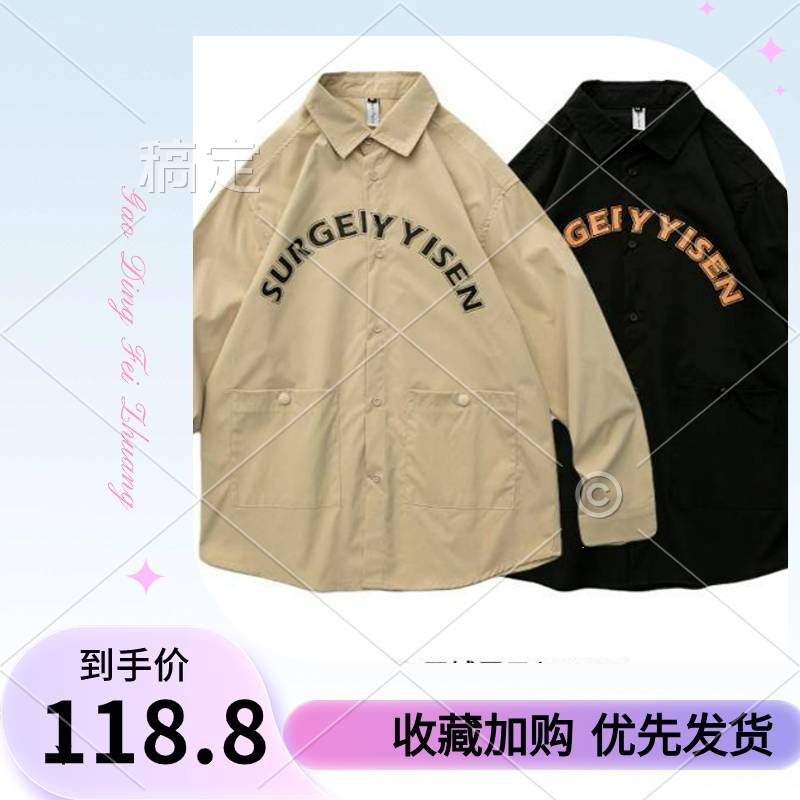 日系简约字母印花长袖工装衬衣男潮牌街头宽松bf风薄外套