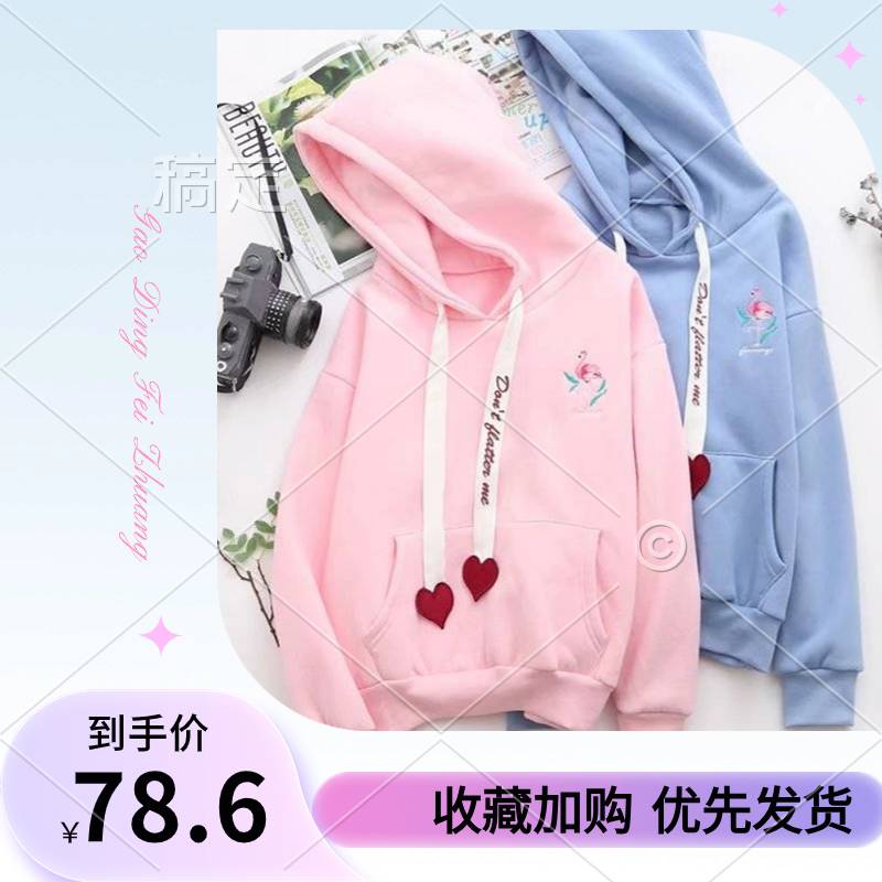 秋冬季韩版卫衣女宽松加厚连帽绒衫上衣飘带刺绣大码长袖