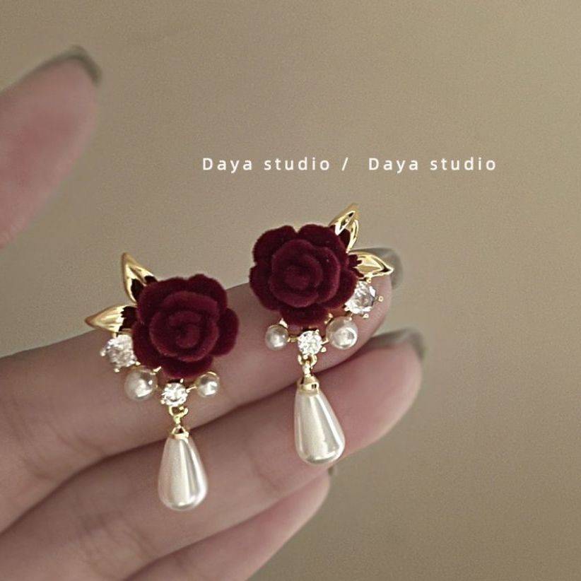 夜莺玫瑰 法式复古丝绒花朵珍珠耳环轻奢高级感仙气质无耳洞耳夹