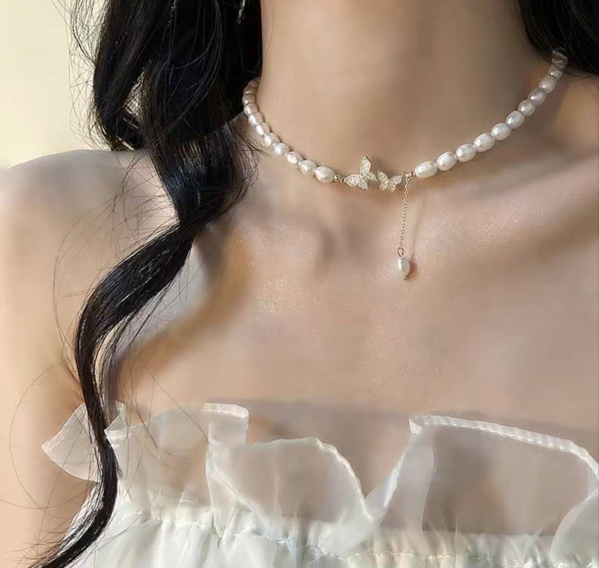 轻奢双蝴蝶珍珠项链女吊坠小众设计感高级感气质锁骨颈链choker