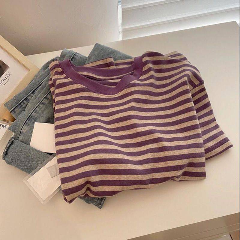 正肩短袖t恤女夏季时尚百搭宽松胖MM显瘦复古条纹半袖纯欲上衣潮