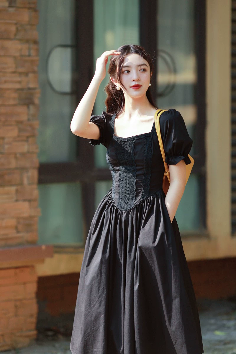赫本风小黑裙高级感收腰显瘦方领法式气质黑色短袖连衣裙女春夏季