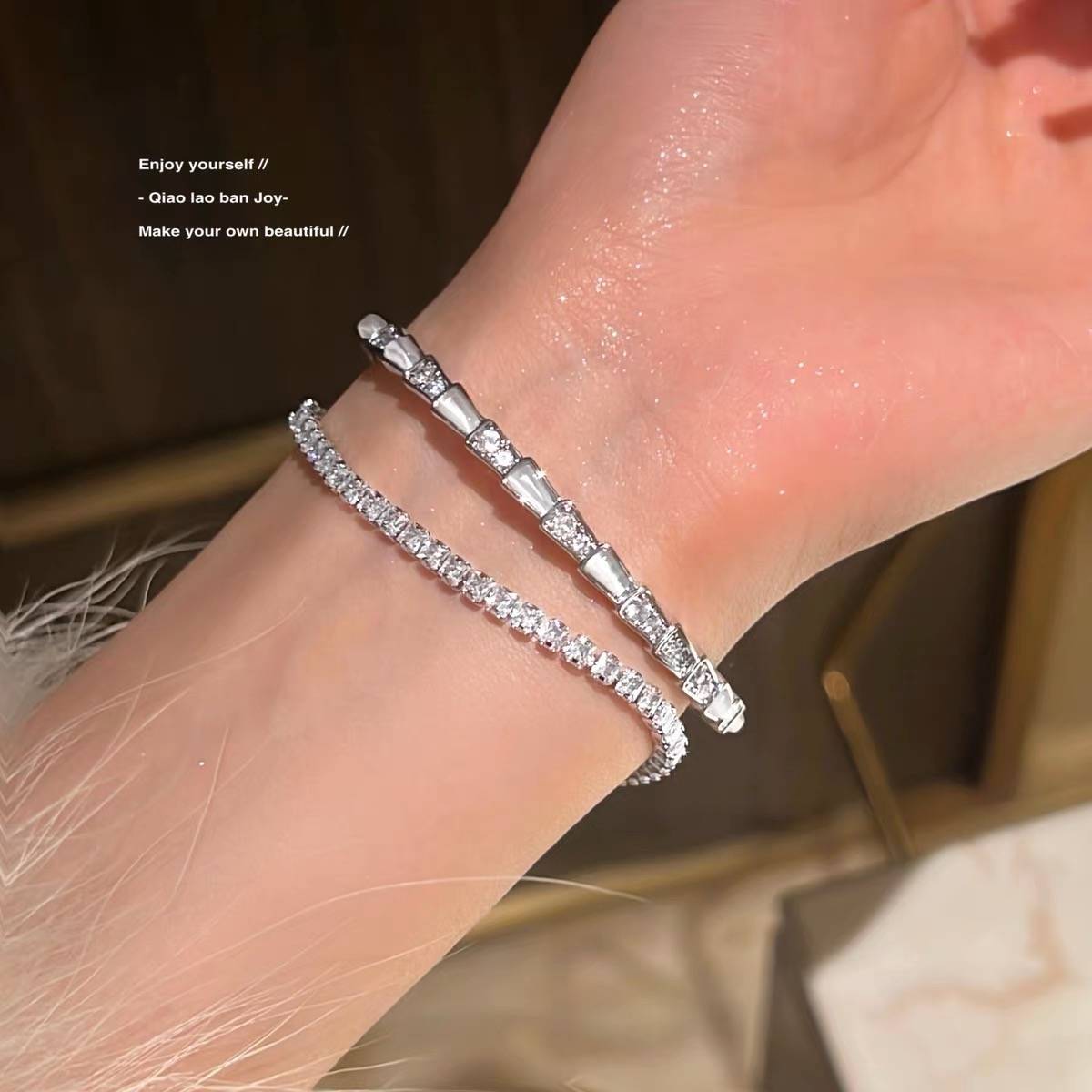【蓝屿紫yee】贝母灵蛇形手镯闪钻质感手链大牌宝石轻奢开口银色