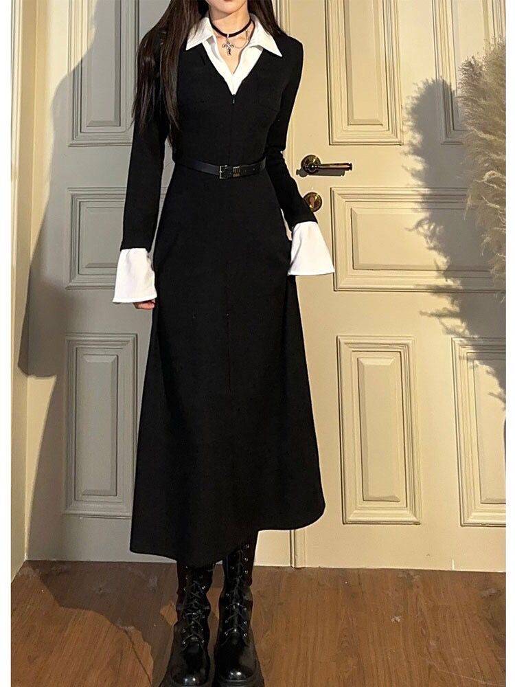 春秋季新款辣妹黑色长袖假两件连衣裙收腰显瘦设计感a字长短裙子