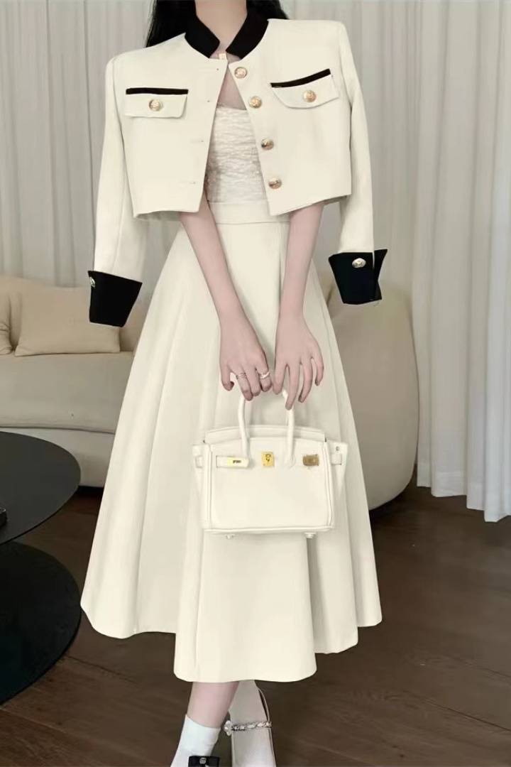 2024新款早春撞色立领短款小香风套装裙两件套气质成熟御姐套装裙
