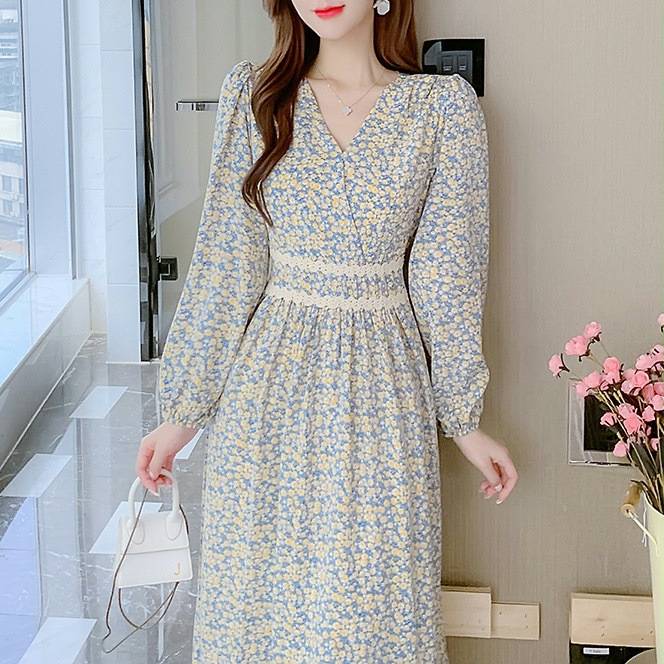 实拍碎花连衣裙欧美春季新款法式v领收腰显瘦英伦风女神范长裙