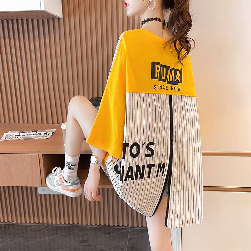 实拍棉2023新款设计感拉链条纹拼接短袖t恤女大码女装网红同款