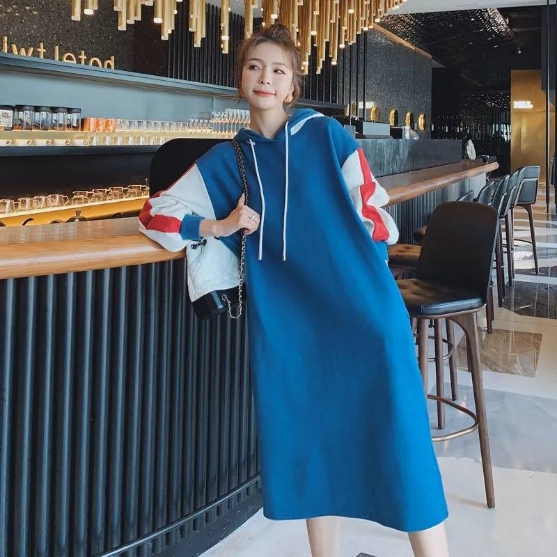 实拍时尚大码长袖卫衣中长裙春秋宽松显瘦撞色连帽连衣裙女装上衣